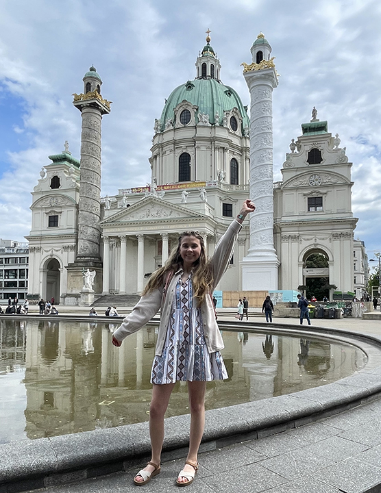 Photo of Madelyn Haines in front of St. Charles in Vienna, May 17, 2025. St. Charles is the cathedral where the group attended a performance of Vivaldi’s “The Four Seasons.” Photo submitted.