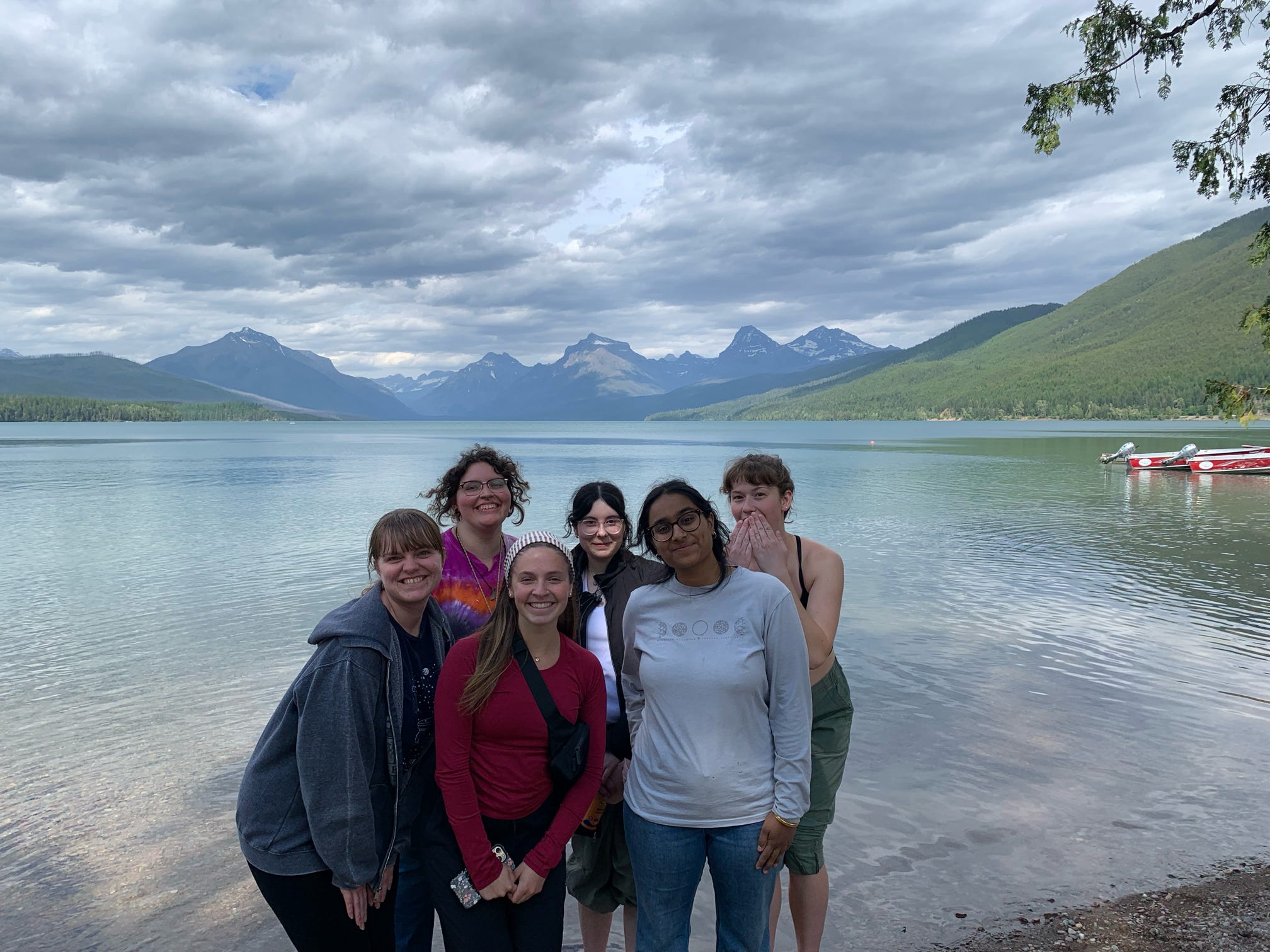 Photo features Honors students Em Acuña (back left), Al Horani (back middle) and other associate editors for UReCA at Lake McDonald in Glacier National Park, West Glacier, Montana, as a part of their annual retreat.